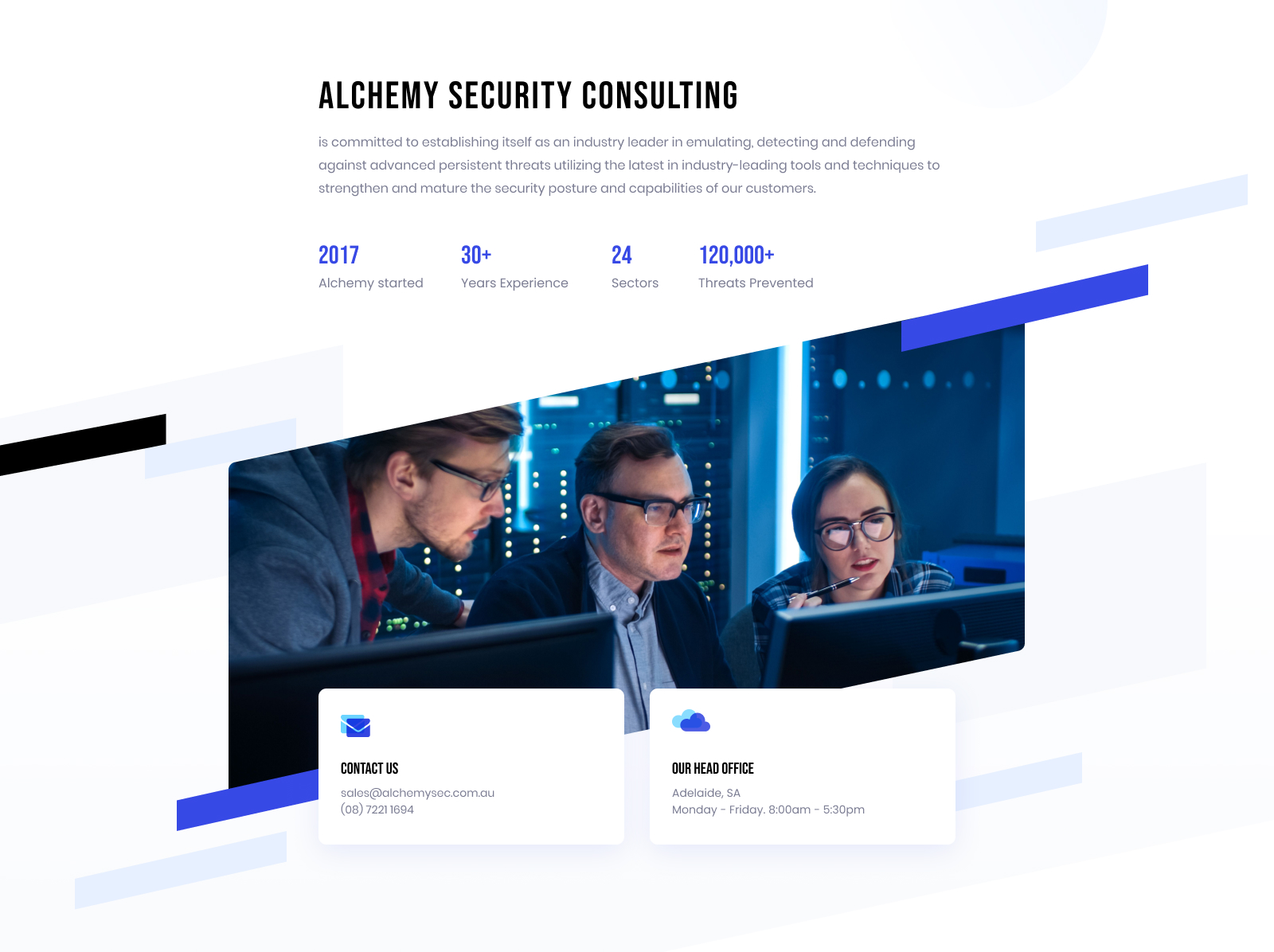 Alchemy needed a site that felt credible without leaning on the industry’s typical “dark and glitchy” tropes. We built a modular, conversion-focused homepage that leads with authority—proof points and outcomes surface early to establish trust fast—then guides users through services with a clear, repeatable grid that makes technical offerings easy to scan and understand.